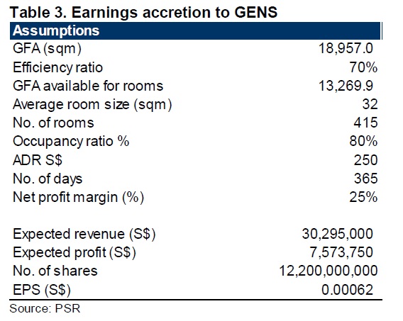 According to CBRE, Singapore’s average occupancy rate and average room rate for the first half of 2012 were 88% and S$249 respectively. Taking into account the location of the hotel, we assume occupancy rate to be 80% and ADR at S$250. We note that Capri by Fraser Changi City has room prices ranging from S$195 to S$390 with sizes from 32 sqm to 67 sqm.